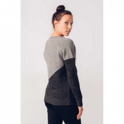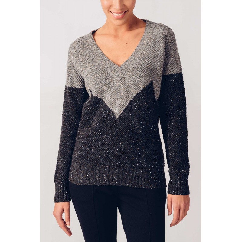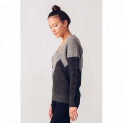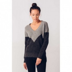 Soft two-tone heathered acrylic sweater with a V-neck and elastic waist and cuffs.