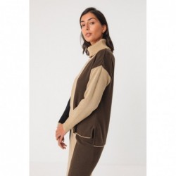 Semi-thick knit sweater with an asymmetrical cut, a high neck and contrasting colored details.