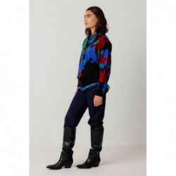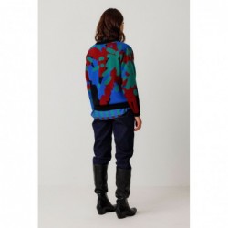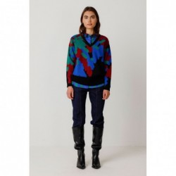 Loose-fitting, multicolored knit sweater with a V-neck, wide long sleeves, and a medium-weight construction. It has a relaxed fit and vibrant colors for a versatile style. Made with GOTS-certified organic cotton.