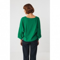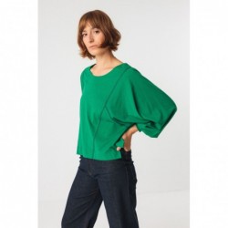 Loose-fitting T-shirt with a round neck and batwing sleeves. Pleated details at the cuffs, side slits, and overlock stitching.