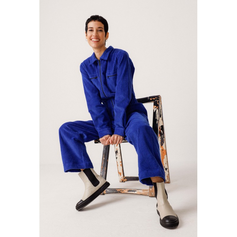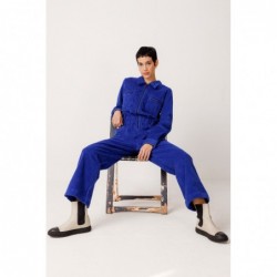 Ankle-length jumpsuit with a shirt collar, long sleeves with cuffs, front zip fastening, patch pockets, and an elasticated waist. Style and comfort in one versatile garment.