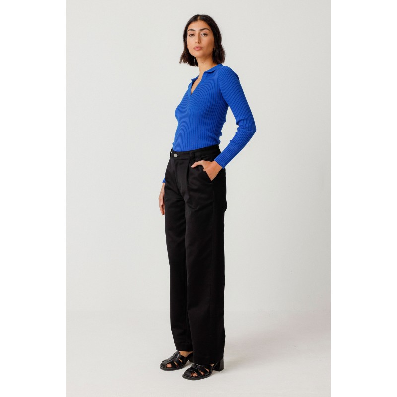Palazzo trousers with a standard waist, slanted pockets, and a front zip fastening. Features faux welt pockets at the back for a sophisticated look.