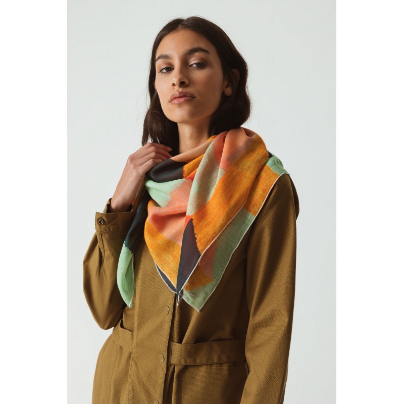 Large square scarf made from GOTS-certified organic cotton. Featuring a multi-color graphic print. Being certified feels great. GOTS is the leading certification for textiles made with organic fibers.