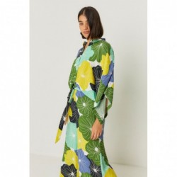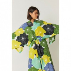 Oversized shirt with 3/4 kimono sleeves, a mandarin collar, and a front button closure.