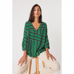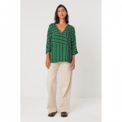 Straight-cut shirt with a V-neck and 3/4-length sleeves. The stripes vary depending on the cut of the fabric, making each style unique.