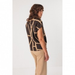 Loose sleeveless shirt with asymmetrical mandarin collar and buttoned front closure.