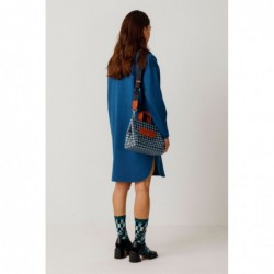 Shopper bag made of leather and recycled cotton with front and back pockets, adjustable and detachable strap, zip closure, and snap buttons for size adjustment. It features an interior pocket and a printed lining and measures 250 x 200 x 150 mm.