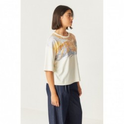 Loose-fitting short-sleeved T-shirt with a round neck.