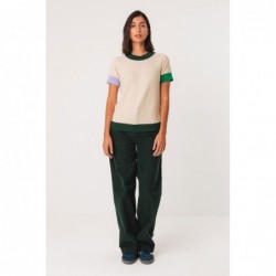 A fine knit T-shirt made from GOTS-certified organic cotton. It features a straight cut, a round neck, short sleeves, and contrasting ribbed trim on the neckline, sleeves, and waist.