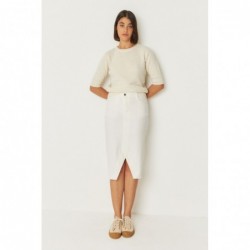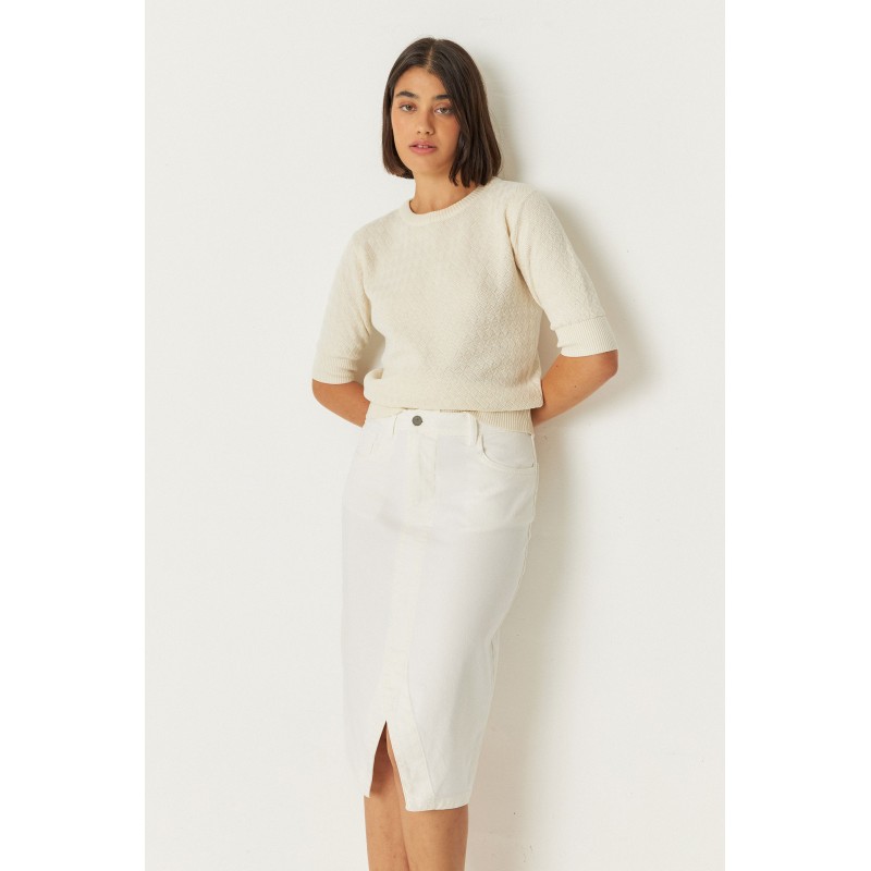 Midi pencil skirt with a front slit, button fly, and back patch pocket. Made in Spain.