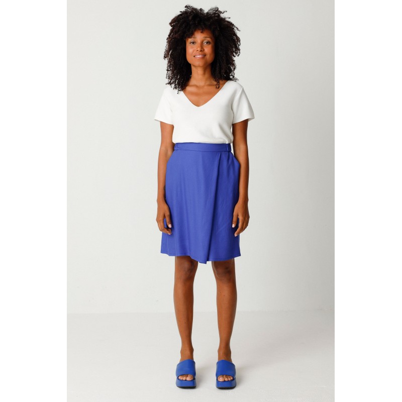 Lightweight A-line short skirt with an asymmetrical pleat at the front. Practical side pockets and a comfortable semi-elastic waistband.