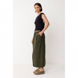 Flared midi skirt with front slit. Zip fly and slanted front pockets.
