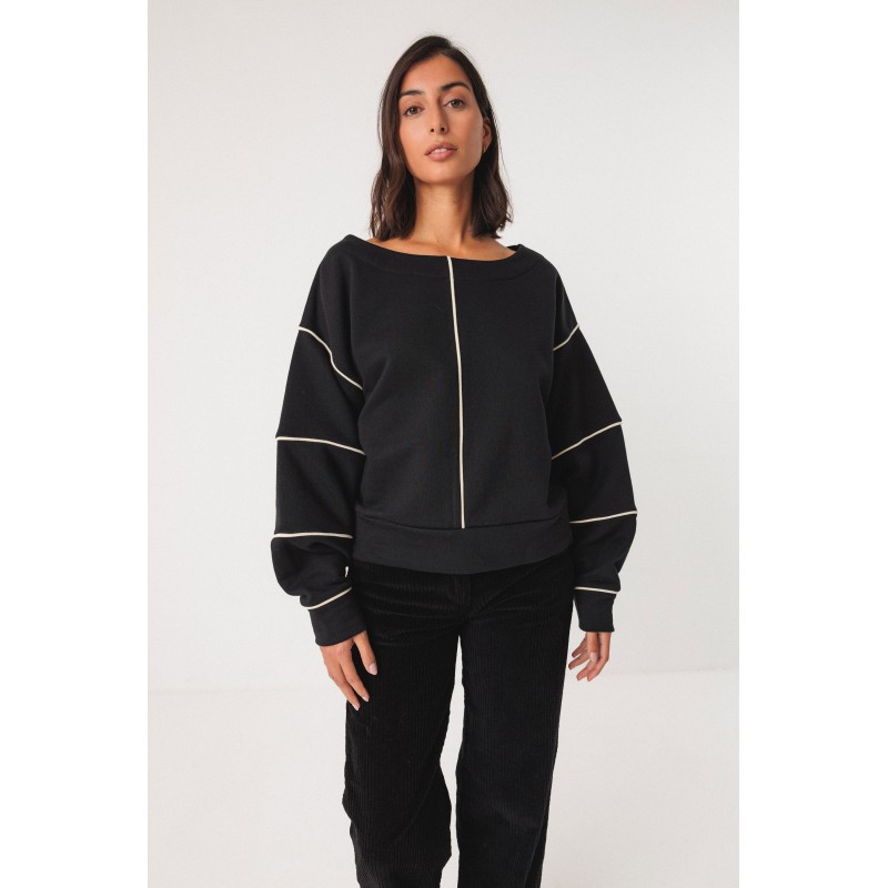 Oversized boat-neck sweatshirt with long sleeves, decorated with colored piping.