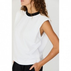 Sleeveless T-shirt with a round neck, shoulder pads, and a contrasting stripe at the neckline. Straight cut.