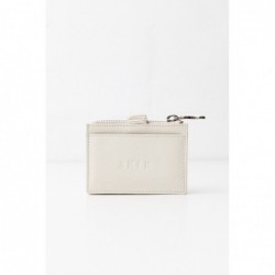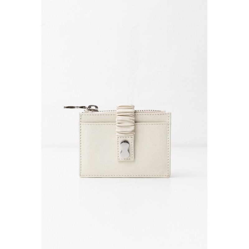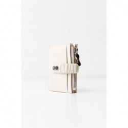 Leather wallet with zip and button closure and pleated strap. Includes card holder and billfold. Measures 10 x 7 cm.
