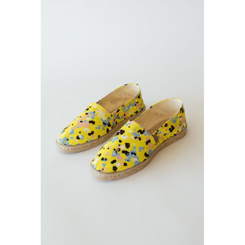 Sneaker in poliestere riciclato, prodotte in Francia. Stampa multicolor su fondo giallo.