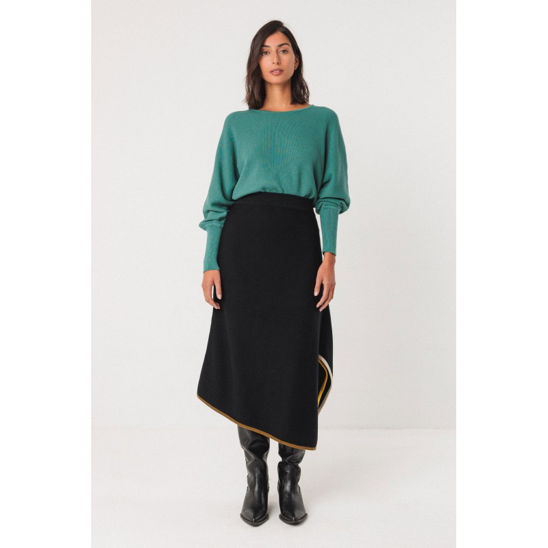 Falda de punto fino de largo asimétrico con unas líneas de color en contraste. Cómoda cintura elástica.
