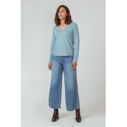 T-shirt basic a maniche lunghe con scollo a 'V' realizzata in cotone biologico a tinta unita (certificato Fairtrade® e GOTS). Crema. Essere certificati è molto bello. Fairtrade® è un modo di fare affari che garantisce che gli agricoltori all'origine del nostro cotone siano pagati equamente; Dà loro anche sussidi per sviluppare progetti comunitari. GOTS è riconosciuto come lo standard di lavorazione leader a livello mondiale per i tessuti realizzati con fibre organiche. Il modello indossa una taglia 38 ed è alto 1,73 m.