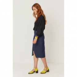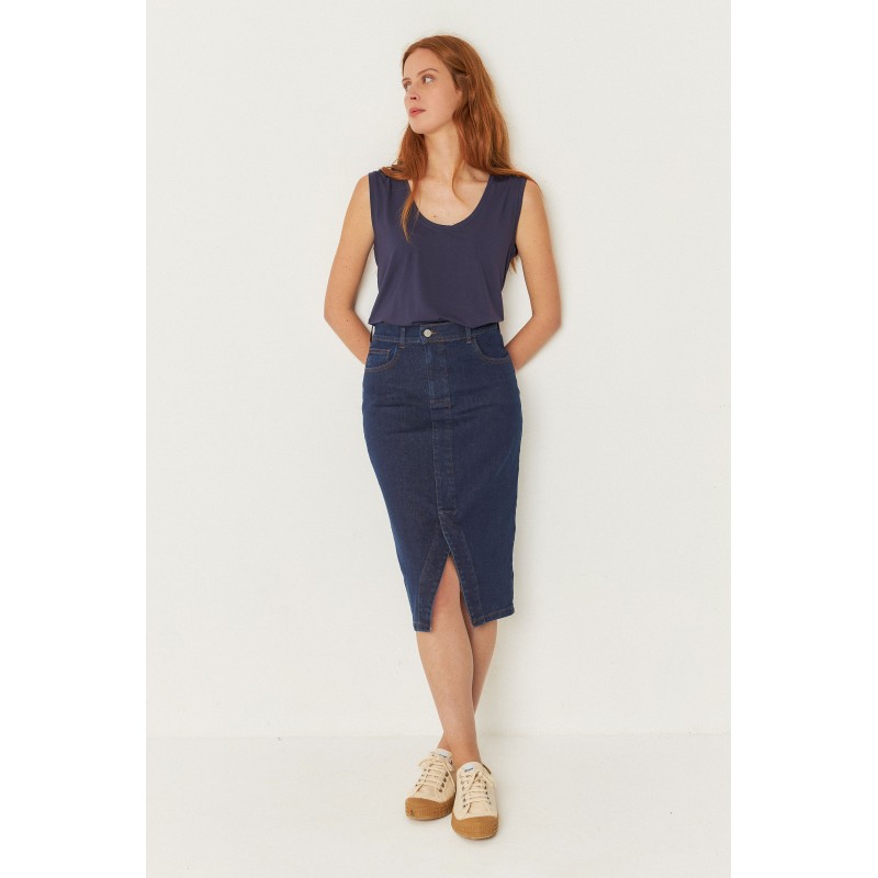Falda lápiz midi con abertura en la parte inferior delantera, bragueta de botones y bolsillo de parche en la parte posterior. Hecha en España.