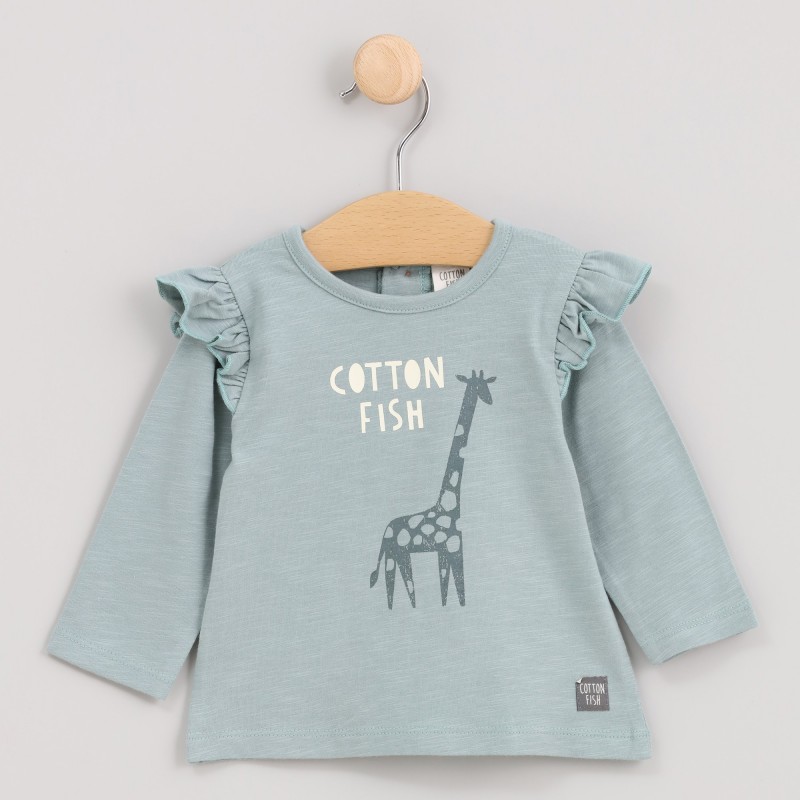 Een T-shirt uit de Jungle-collectie met ruches op de schouders, ontworpen voor een comfortabele en charmante look. Gemaakt van een zachte stof, met een subtiel giraffenborduurwerk aan de zijkant voor een speelse en originele touch. Perfect te combineren met een legging of broek uit dezelfde collectie.