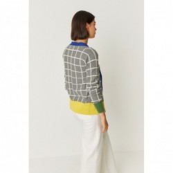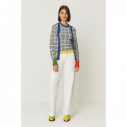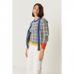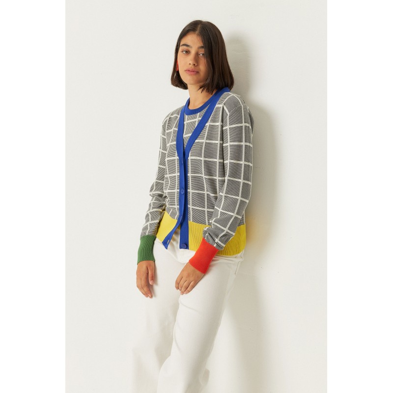 Vest met V-hals en knoopsluiting, versierd met geribbelde boorden aan de hals, manchetten en taille.
