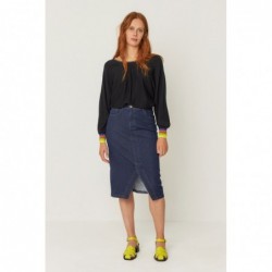 Trui met vleermuismouwen en een V-hals aan de achterkant. Geribbelde boorden bij de hals, taille en manchetten.