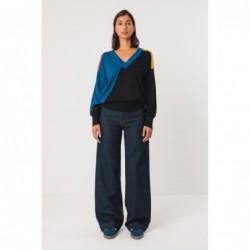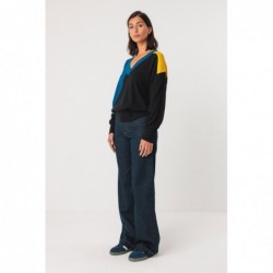 V-hals trui met verlaagde schoudernaden en vleermuismouwen. Gemaakt van fijn breisel met een contrasterend kleureffect.