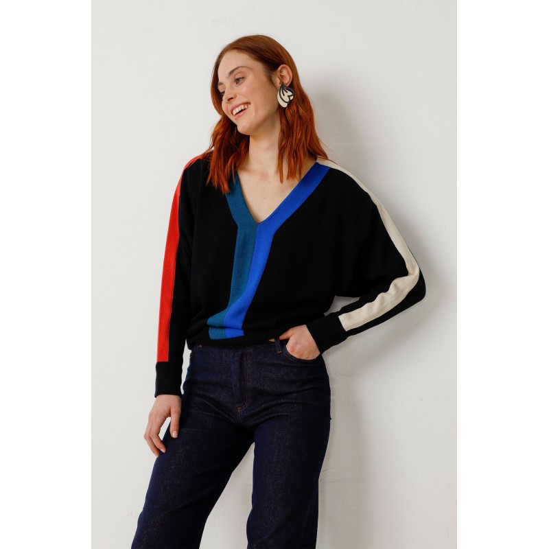Trui met kleurblokken, een V-hals, lange vleermuismouwen en verlaagde schouders. Een middelzwaar kledingstuk met een modern design. GOTS-gecertificeerd biologisch katoen.