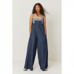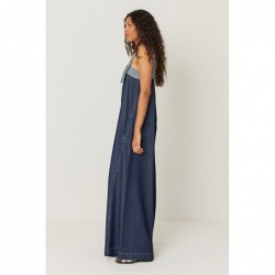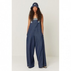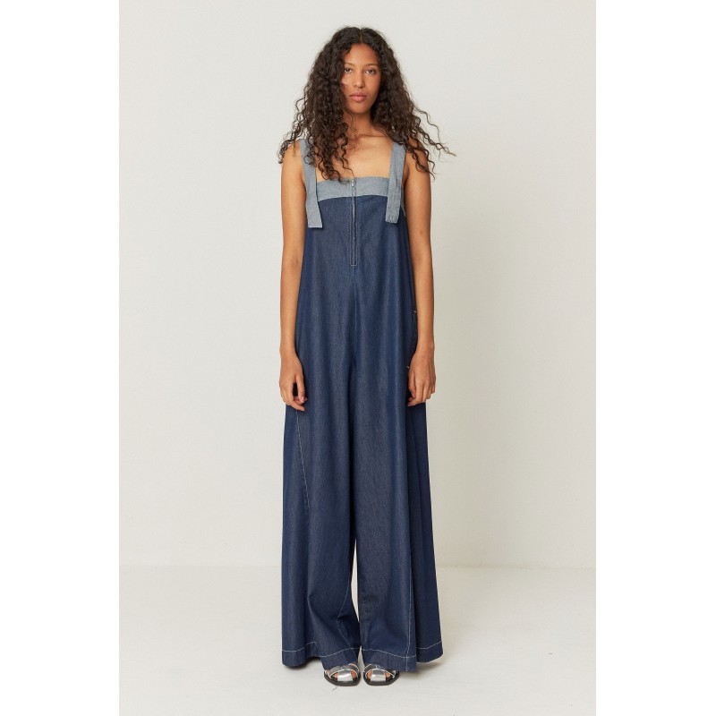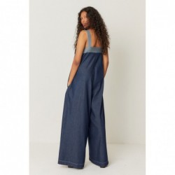 Losse denim jumpsuit met zakken aan de voorkant en decoratieve stiksels. Ritssluiting.