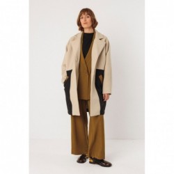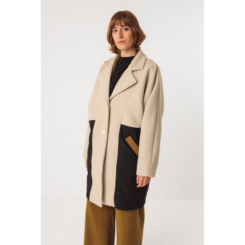 Losvallende wollen jas, gemaakt van een mix van verschillende materialen en kleuren. Met knoopsluiting aan de voorkant en volledig gevoerd.