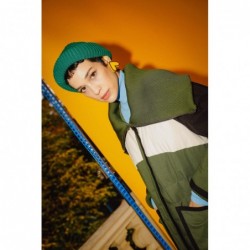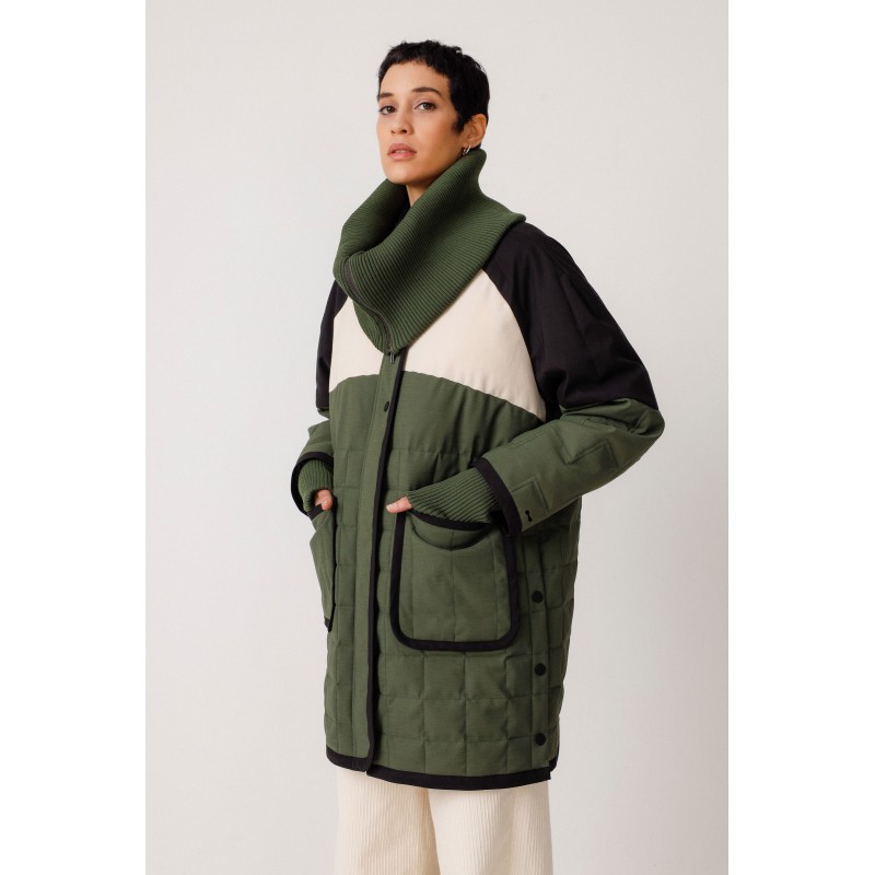 Korte driekleurige jas met geribbelde opstaande kraag en grote zakken aan de voorkant. Sluit met rits en drukknoop, en met extra drukknopen aan de zijkanten. Samenwerking met Martina Spetlova.