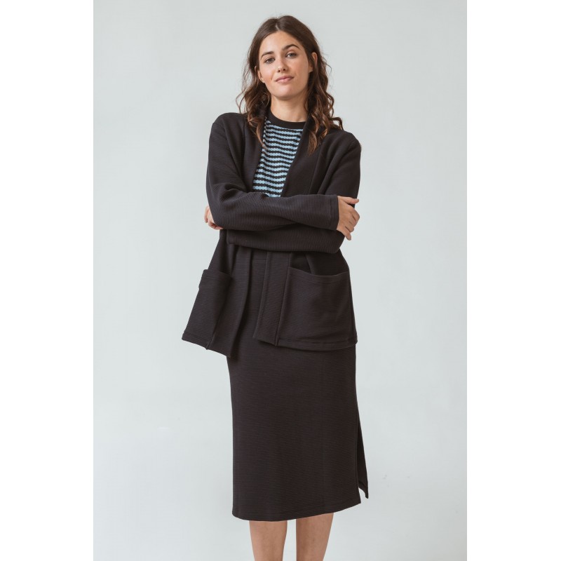 Lange, rechtgesneden cardigan, gemaakt in Portugal van biologisch katoen met een structuur. Voorzien van een sjaalkraag, lange mouwen en voorzakken. Biologisch katoen wordt geteeld met methoden en middelen die een minimale impact op het milieu hebben. Er worden geen giftige meststoffen of pesticiden gebruikt bij de teelt en de bodem behoudt zijn vruchtbaarheid.