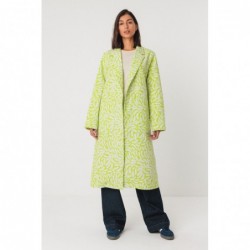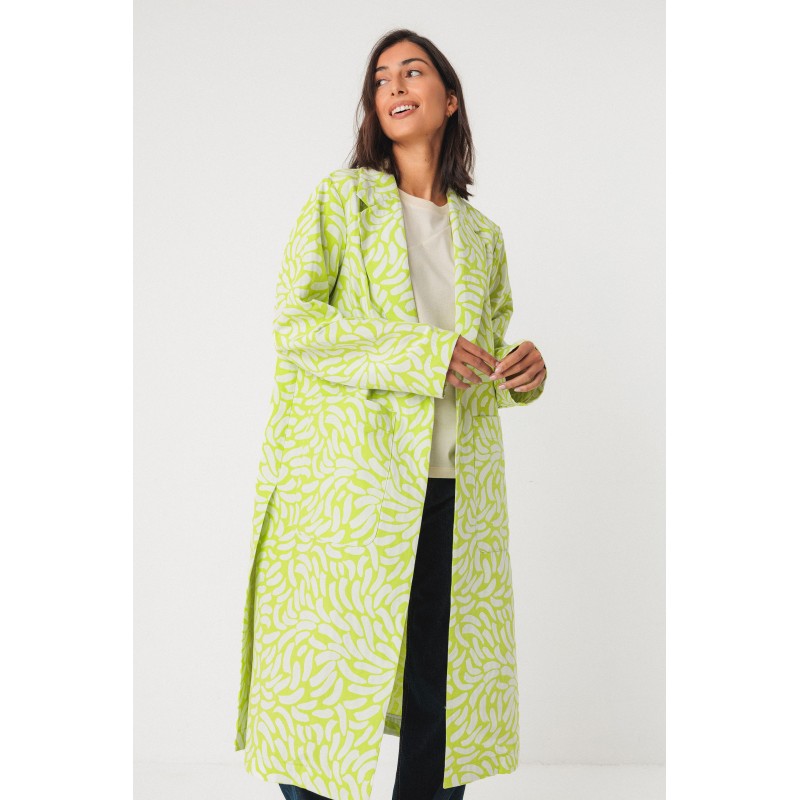Lange, losvallende, knielange open jas met opgestikte zakken. Limekleurige print.