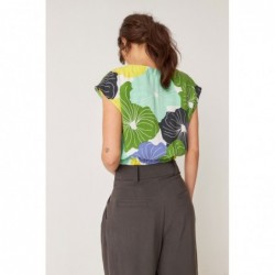 Mouwloos shirt met V-hals en elastische tailleband. Knoopsluiting aan de voorkant.
