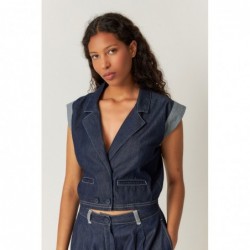 Kort, mouwloos denim overhemd. Kruiskraag met kanten zoom. Verlaagde schouders.