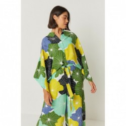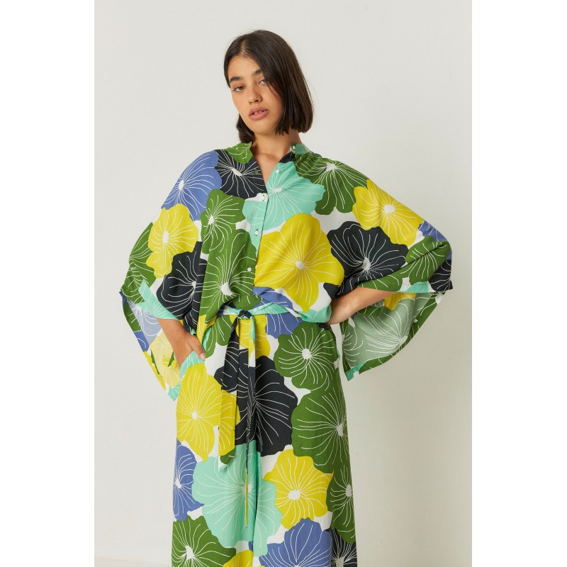 Oversized shirt met 3/4 kimono mouwen, een opstaande kraag en een knoopsluiting aan de voorkant.