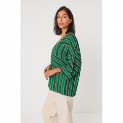 Recht model shirt met V-hals en driekwartmouwen. De strepen variëren afhankelijk van de snit van de stof, waardoor elke stijl uniek is.