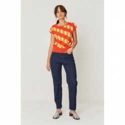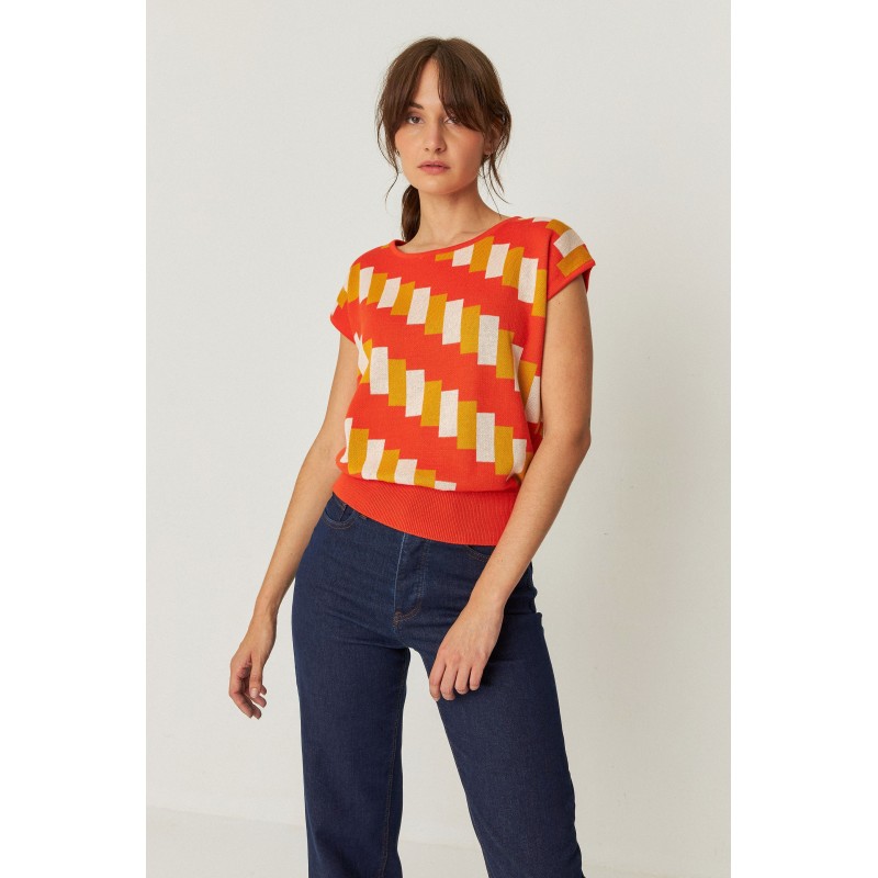 T-shirt van biologisch katoen met korte mouwen, jacquardbreisel, boothals, verlaagde schouders en getailleerde taille.
