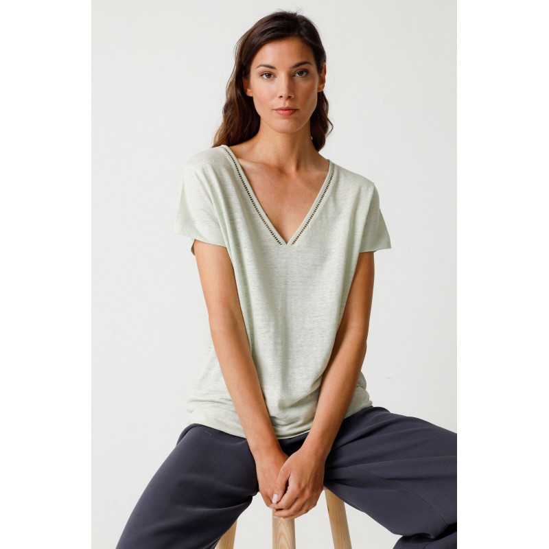 T-shirt gemaakt in Portugal met Europees linnen, korte mouwen met een diepe V-hals en een gehaakt detail rondom.