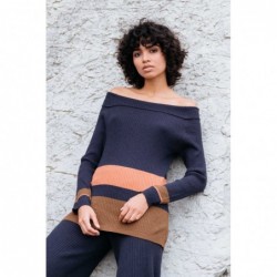 Deze fijn geribbelde top met strepen die zijn geïnspireerd op geologische lagen, is warm en accentueert je rondingen dankzij de boothals.