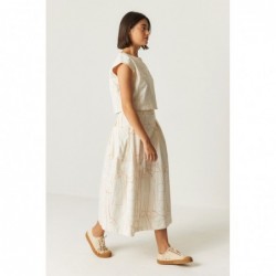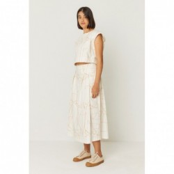 Uitlopende midirok met opgestikte zakken aan de zijkanten.