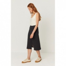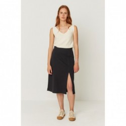 Wijd uitlopende rok tot onder de knie met elastische taille en een split aan de voorkant.