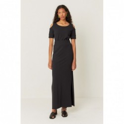 Lange, rechte rok met elastische tailleband en zijsplitten.