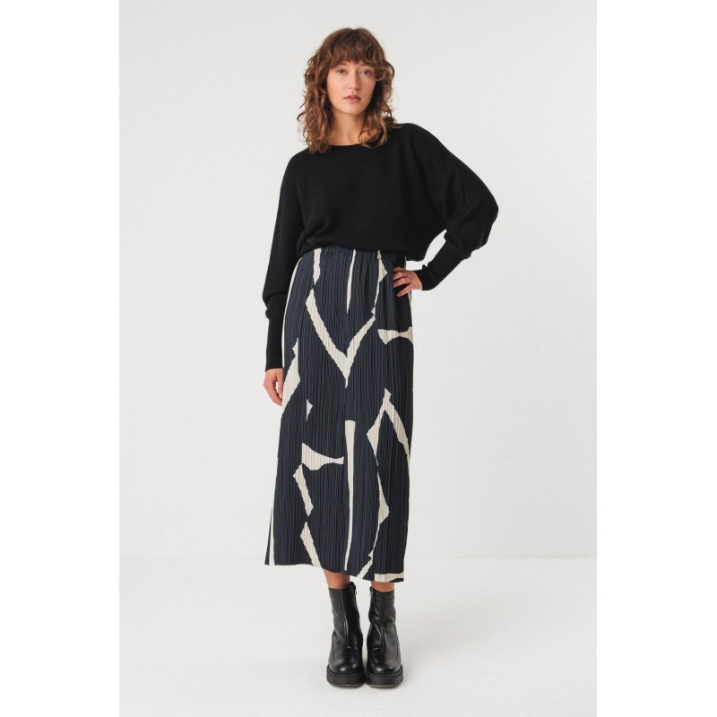 Geplooide midi-rok van stof met elastische tailleband voor eenvoudig aan- en uittrekken.