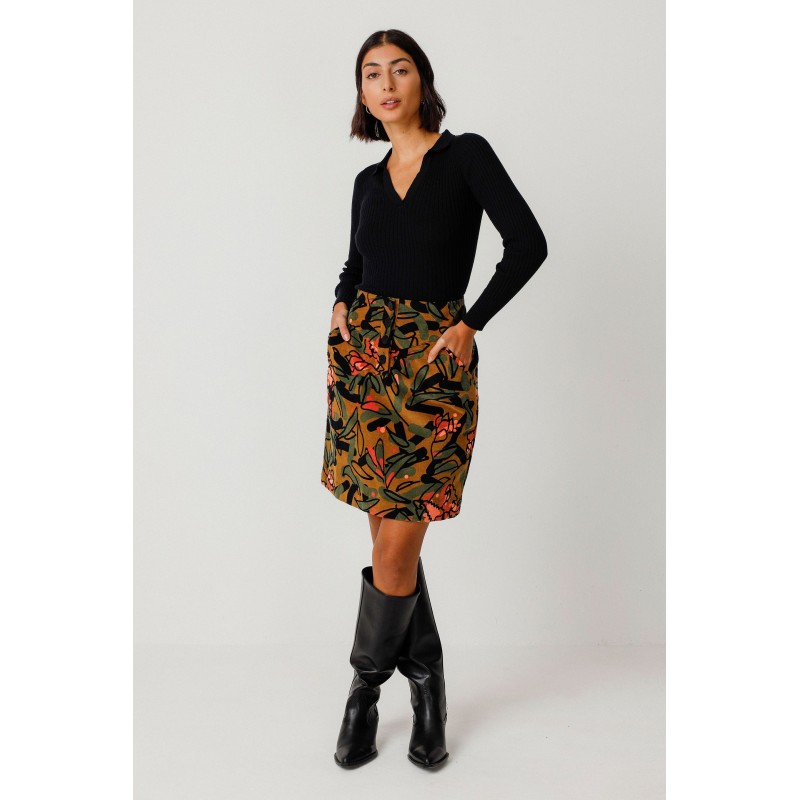 A-lijn rok, boven de knie, met een hoge taille, zakken aan de voorkant en een knoopsluiting. De veelkleurige bloemenprint geeft je look een vrouwelijke touch. GOTS-gecertificeerd.