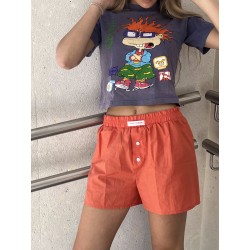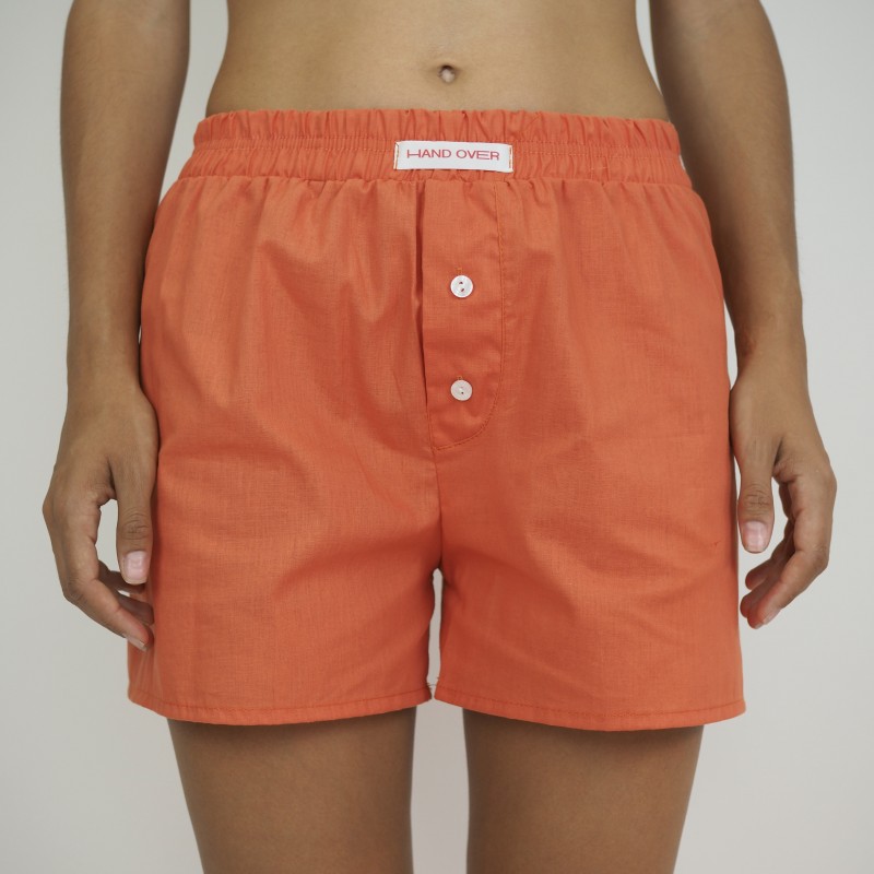 Orlando, met zijn stralende glimlach en vrije geest, won mij meteen voor zich. Wij ontmoetten elkaar op een feestje. Zijn passie voor het leven werkte aanstekelijk. Hoewel zijn avonturen en mijn verlangen naar stabiliteit ons uit elkaar dreven, zal ik altijd zijn romantische gebaren herinneren en de manier waarop hij mij leerde in het moment te leven. Onze tijd samen was kort, maar onvergetelijk. Unisex boxershorts met hoge taille, elastische tailleband en knoopsluiting aan de voorkant. Oversized kledingstuk. Afmetingen: Model is 1,70 cm (5'7") en draagt een Hand Over maat S. Borstomvang: 86 cm (34 inch) Tailleomvang: 66 cm (26 inch) Heupomvang: 95 cm (37 inch)