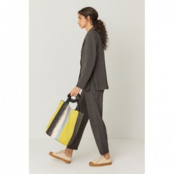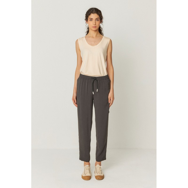 Enkellange chinobroek met verstelbare elastische tailleband en trekkoord. Steekzakken aan de zijkant.