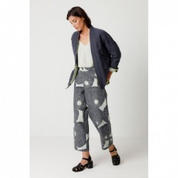 Ruimvallende pantalon met hoge taille in een opvallende jacquardstof. Praktische steekzakken en een ritssluiting aan de voorkant. Oosterse print.