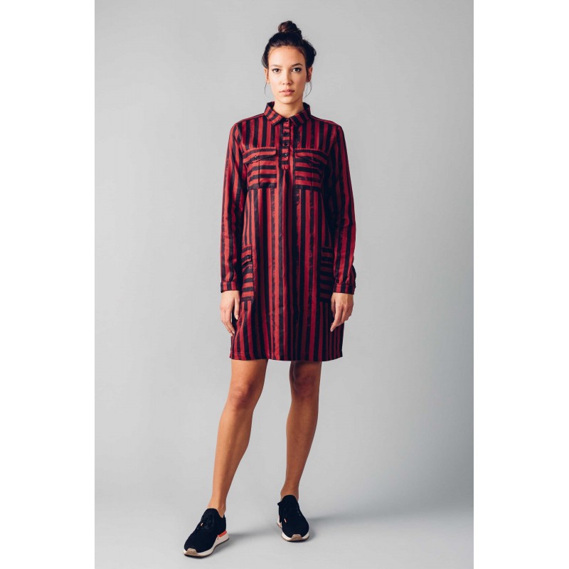 Originele, recht gesneden jurk boven de knieën, met opgestikte zakken aan de voorkant en een verticale strepenprint.