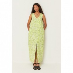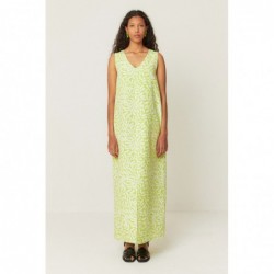 Lange, mouwloze, uitlopende jurk. Gemakkelijk aan te trekken, met een V-hals, steekzakken en een split aan de voorkant.